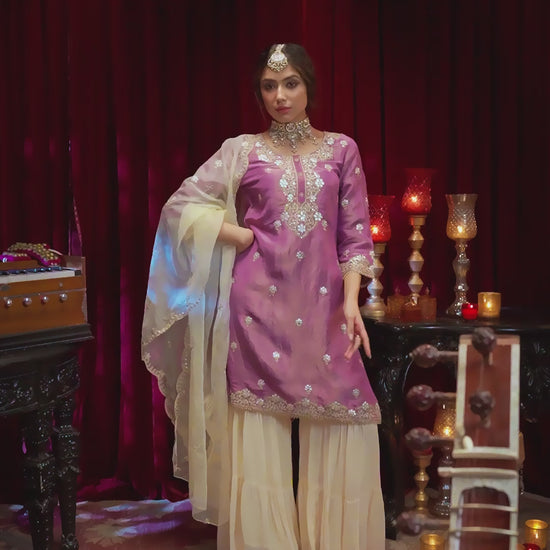Onion Bloom – Pastel Pink Embroidered Kurta with Ivory Sharara & Dupatta